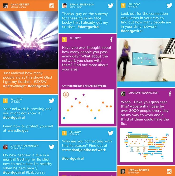 Throughout a variety of social media, a hashtag of the campaign tagline will strengthen and compel the online population to be more aware of how they could be connecting with the flu offline. A mixture of tweets, Facebook posts, and Instagram hashtags will make #dontgoviral go viral.